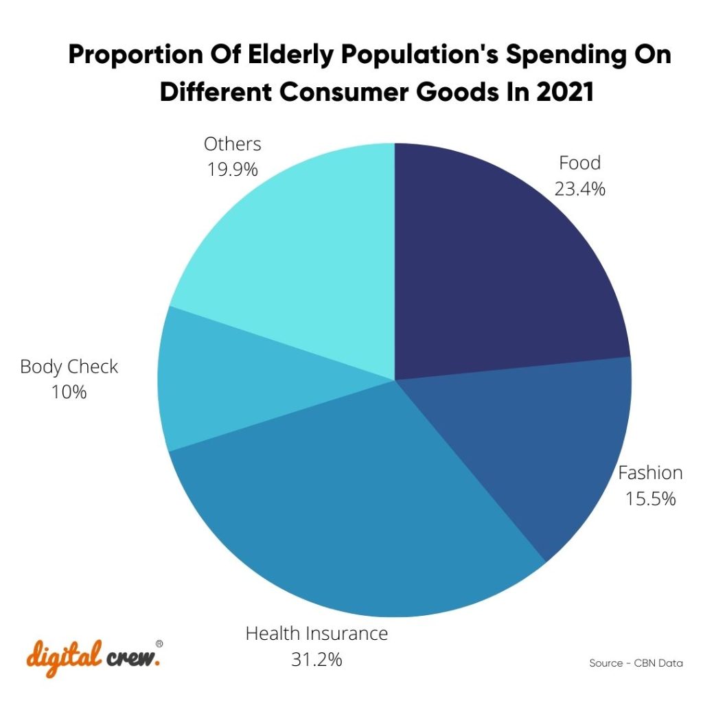 3) Food, health care, medical treatment, and physical examinations are currently the most important consumer products for China’s elderly. Some of the most popular consumer categories are clothing, shoes, and apparel, health supplements, travel items & services, and insurance/financial products.