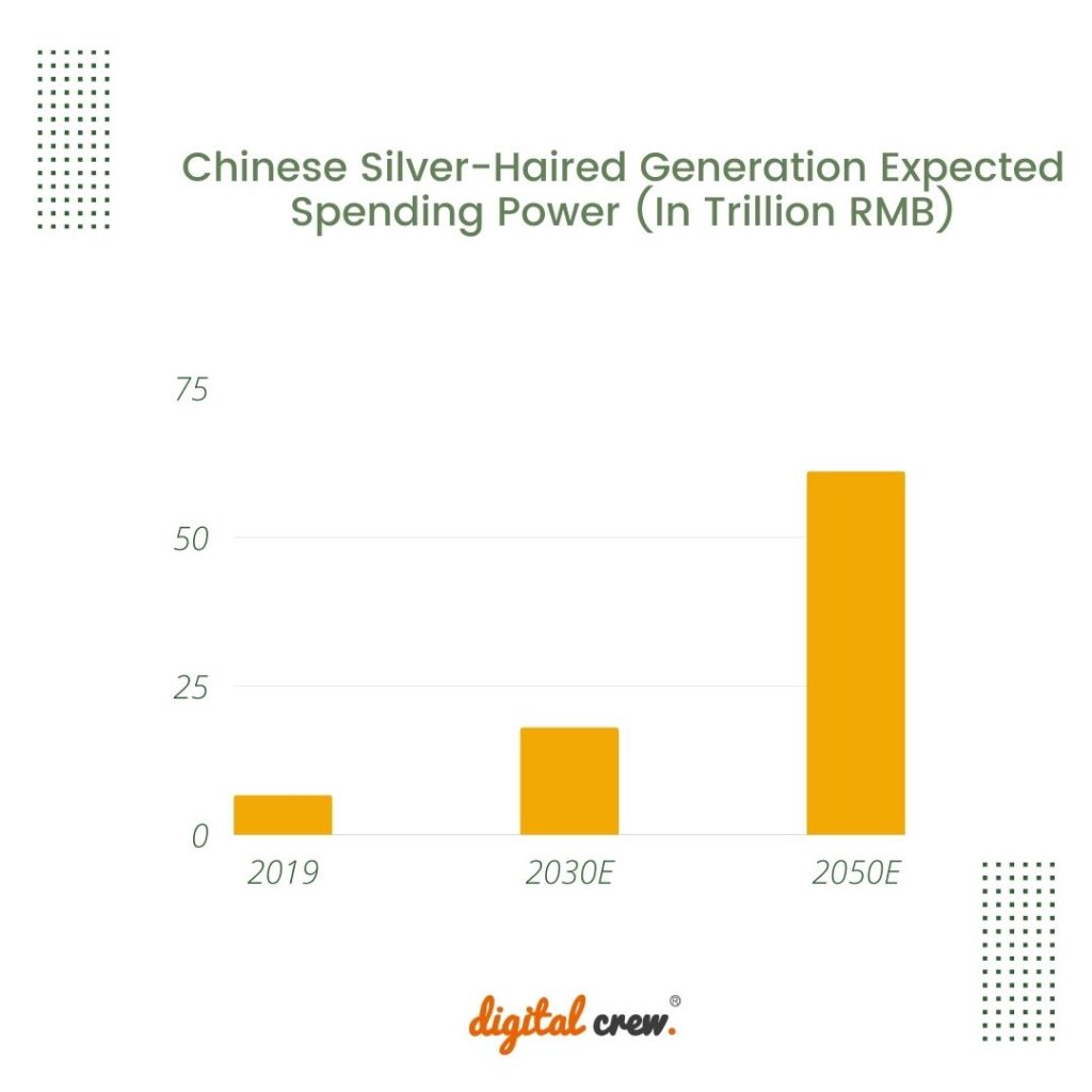The silver economy of China has enormous growth potential. The market is expanding, and the spending power of the silver hair generation is predicted to reach 18 trillion by 2030. The Silver-haired generation in the second and higher-tier cities have more time and money, and are more open to new experiences. They account for more than 60% of the total.